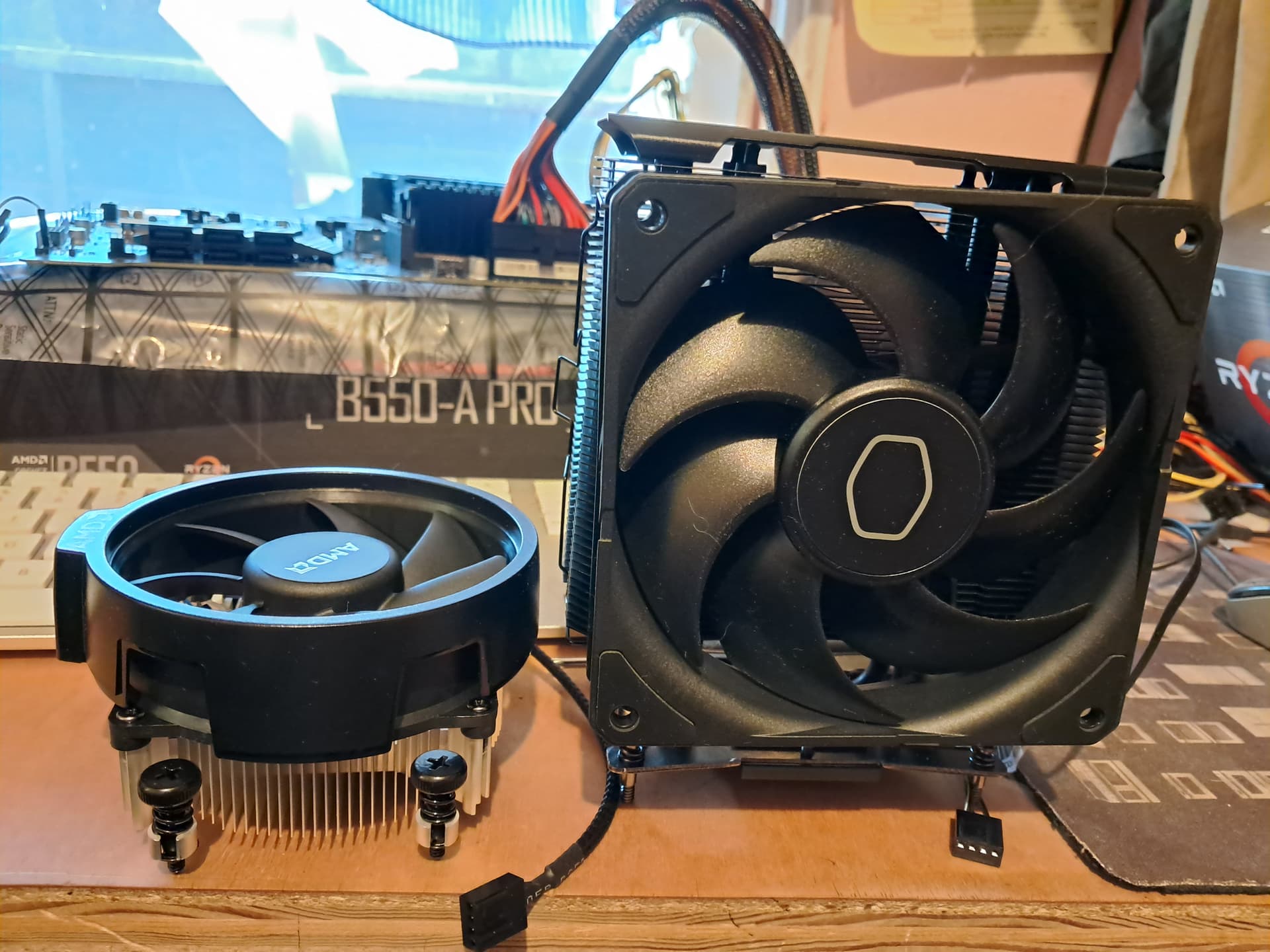 So, then I was under the impression that the “Wraith” fan that came with the 5700G did not include a tube of thermal paste, as the Cooler Master Hyper 212 fan I bought to get the 5700X going with a fan had included . . . . I got the two fans out for a quick cell shot . . . nothing mentioned on the Wraith box about, “watch out for thermal paste already thinly installed for your convenience,” . . . and I set it down on the table . . . next to the Cooler master tower model. I wanted to ask for opinion on which fan to use . . . and/or preferred thermal paste to use to install either of the fans . . . .