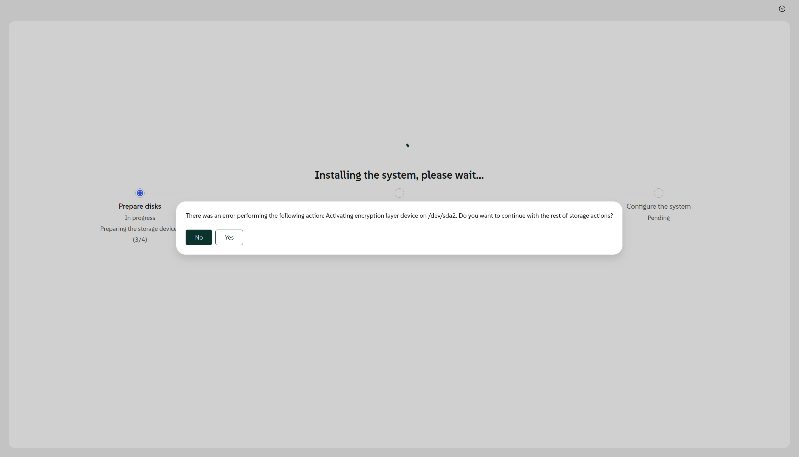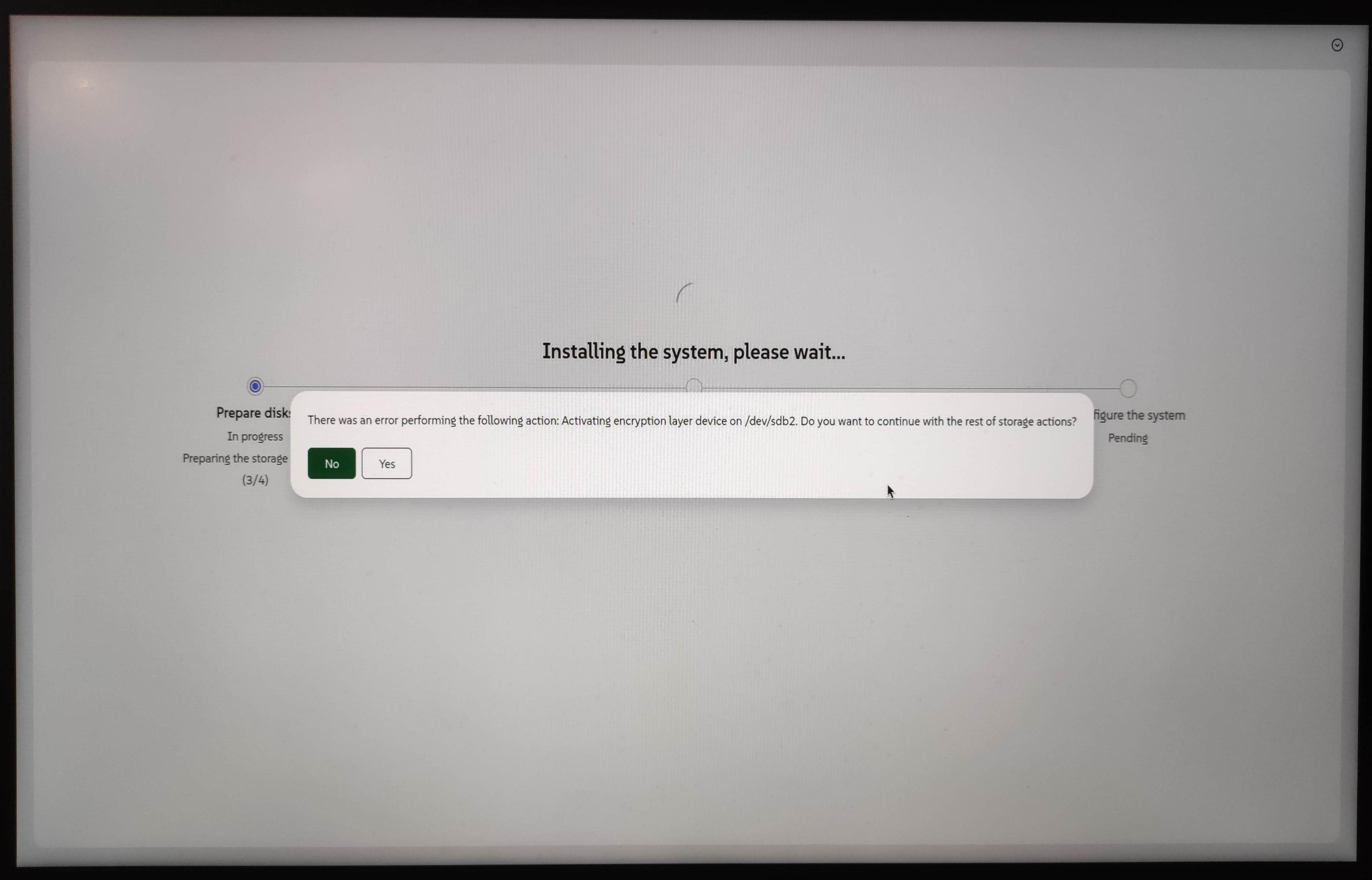 Mar 07 14:27:57 agama agamactl[3368]: 2026-03-07T13:27:57.422761Z INFO agama_server::questions: agama-server/src/questions.rs:122: Creating new question with text: There was an error performing the following action: Activating encryption layer device on /dev/sda2. Do you want to continue with the rest of storage actions?.