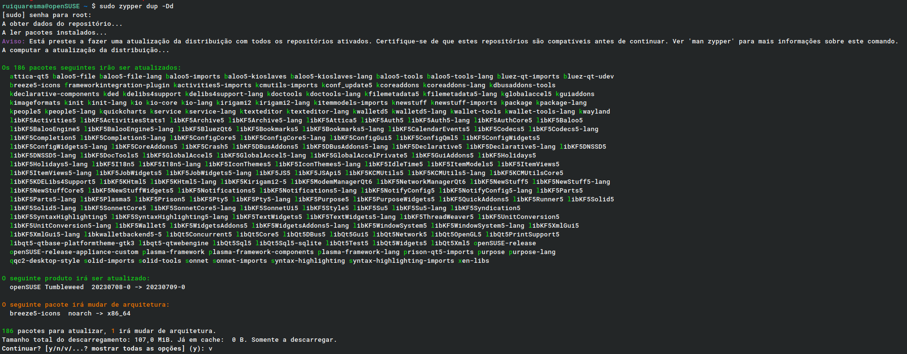 O comando “zypper dup -Dd” não atualiza efetivamente, rle só baixa os pacotes e testa se tem ou não pacotes conflitantes (opção D, dryrun: não faça nada, usada com a opção “d”, que baixa os pacores e mantém eles no cache)…