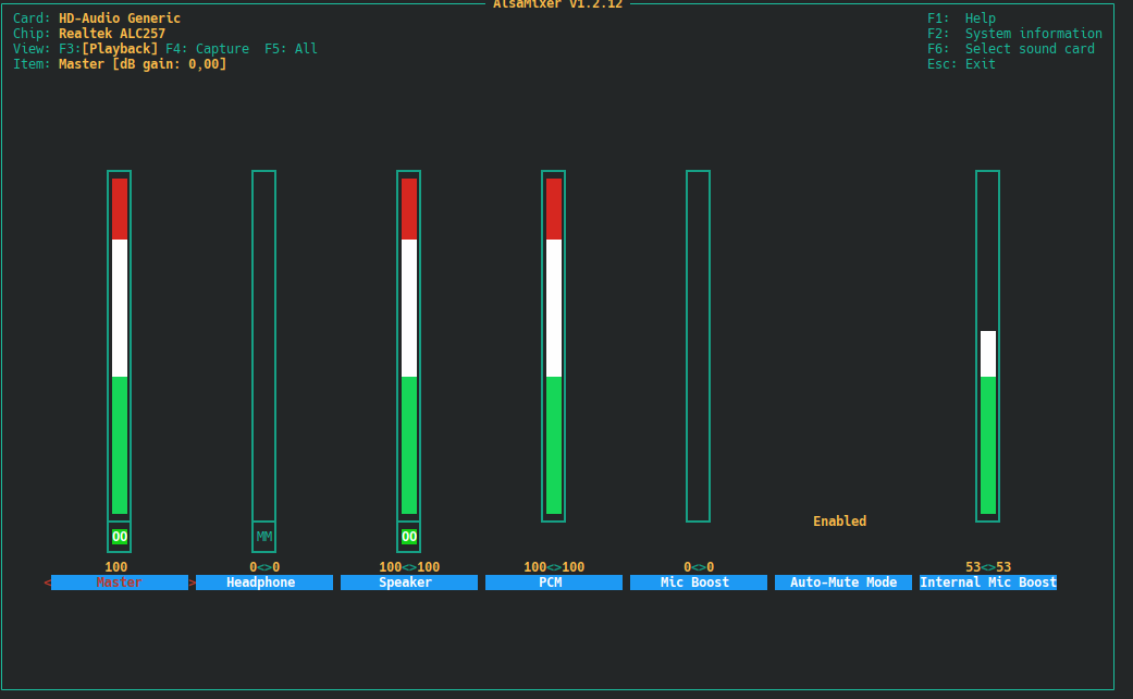 alsamixer looks normal, “no bass at all” is no surprise in a laptop, the ALC257 seems working.