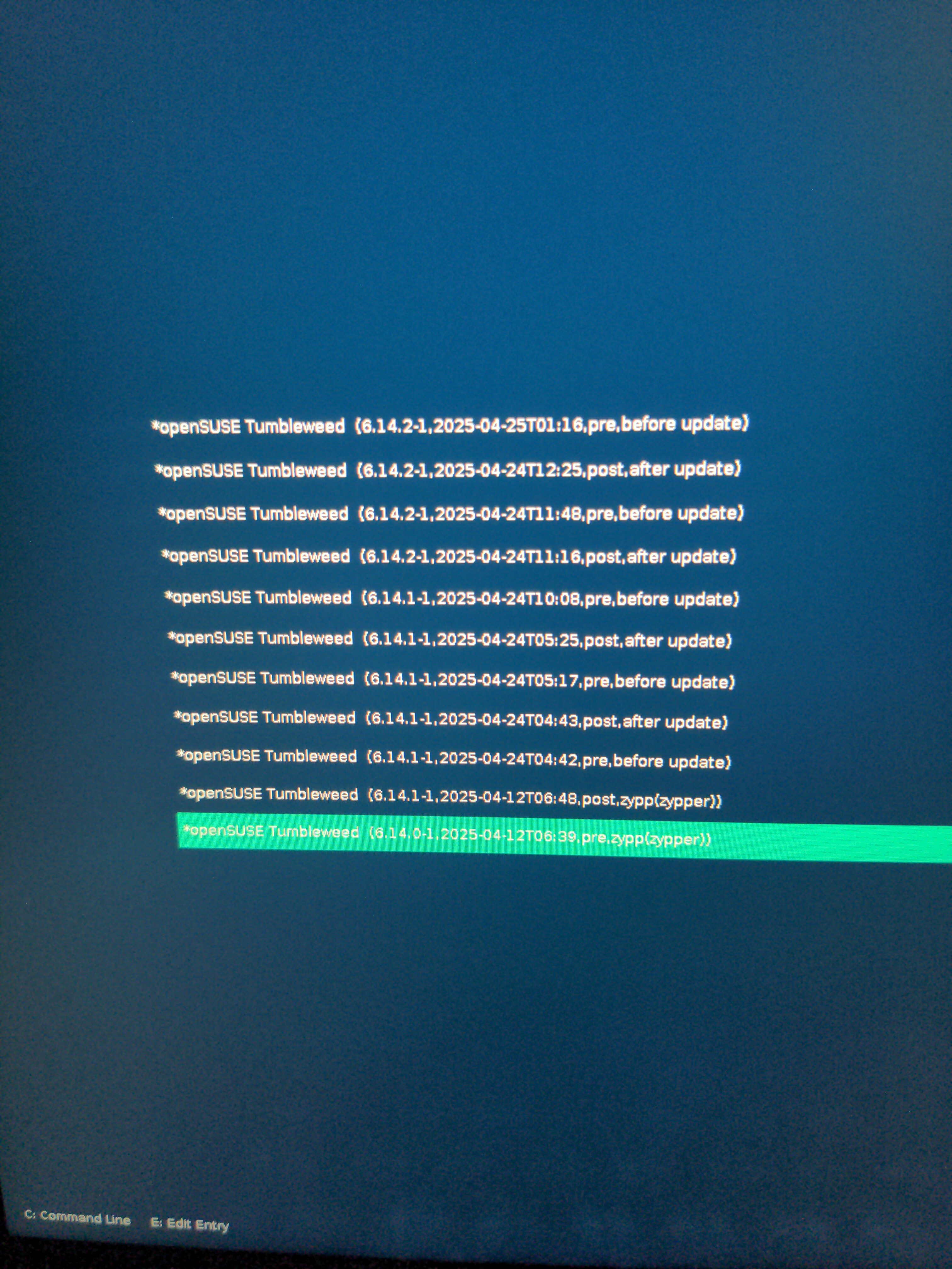 Tumbleweed in stalling at loading initial ramdisk or shortly after and black screening. It occurred after updating the system and having to do a hard reboot after the system wouldn’t shutdown.