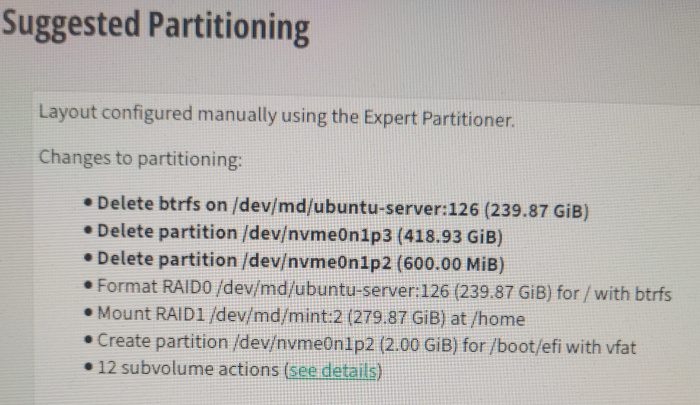 I attempted to install again. This time I enlarged the EFI partition but the installation ended with the same error. Here are the screenshots of the relevant steps (one per post due to quota for new users).