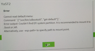 Hi, I cannot install the latest OpenSUSE Tumbleweed. The installer complains about missing /boot/efi even that I made a 600MB one vfat marked EFI partition + format.