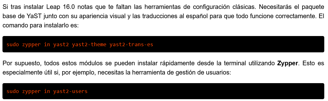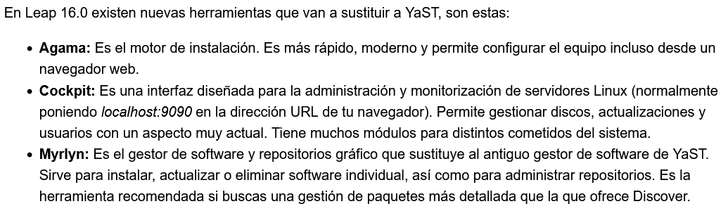 [Nuevo] Sección de Transición: Se añade un bloque informativo sobre el cambio de paradigma en Leap 16.0, donde YaST deja de ser parte de la instalación mínima por defecto.