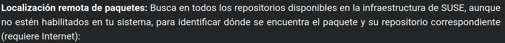 Localización remota de paquetes: Busca en todos tus repositorios disponibles, aunque no estén habilitados, para identificar dónde se encuentra el paquete y su repositorio correspondiente (requiere Internet):