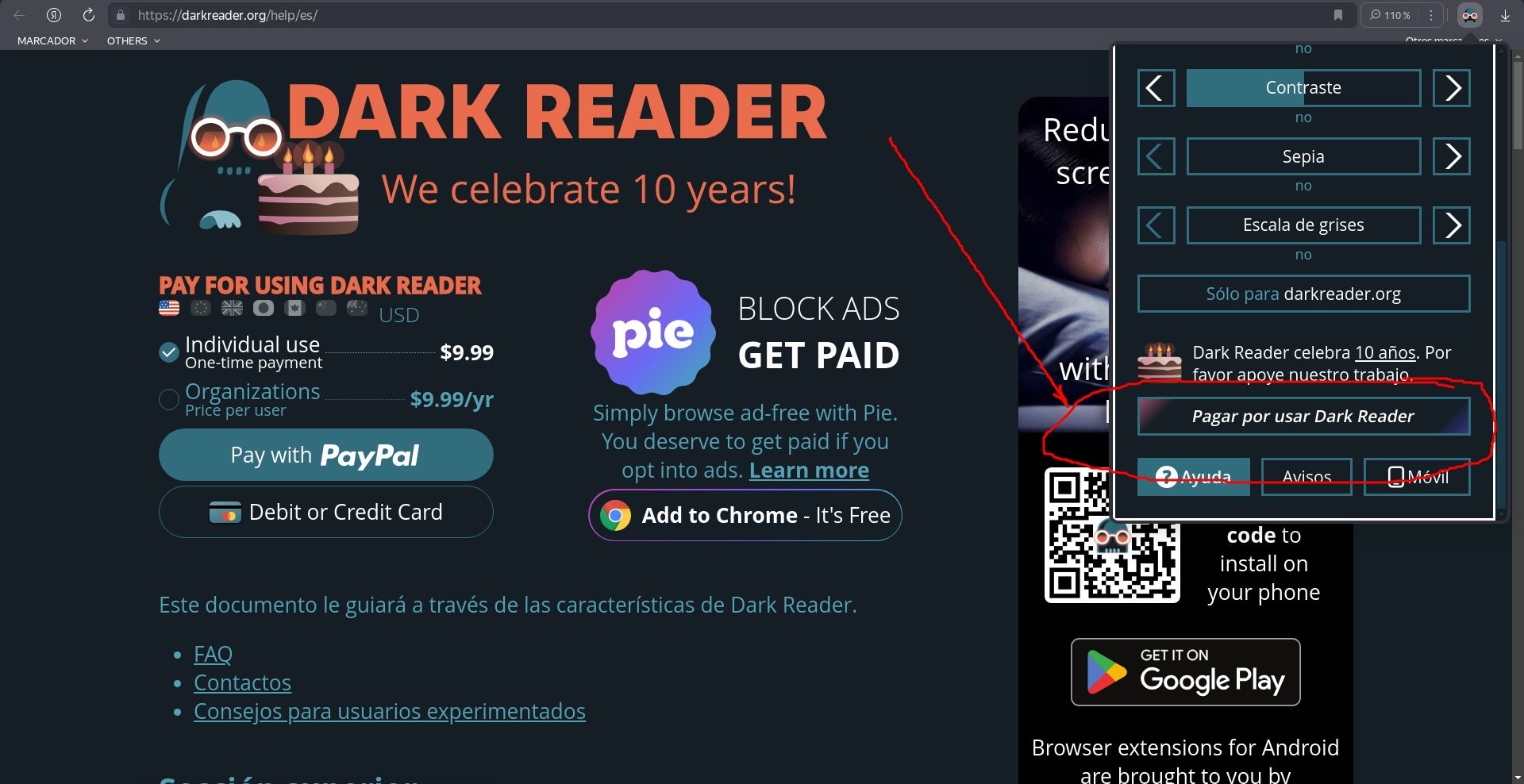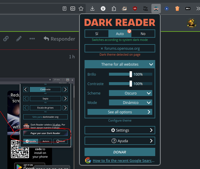 Mientras configuraba hoy el nuevo sistema me doy cuenta que ya la aplicación ´Dark Reader´ no es gratis, al menos no en las funciones principales, como la de colorear el texto, ahora solo invierte colores, da un claro-osbcuro como otras tantas que he visto gratis.