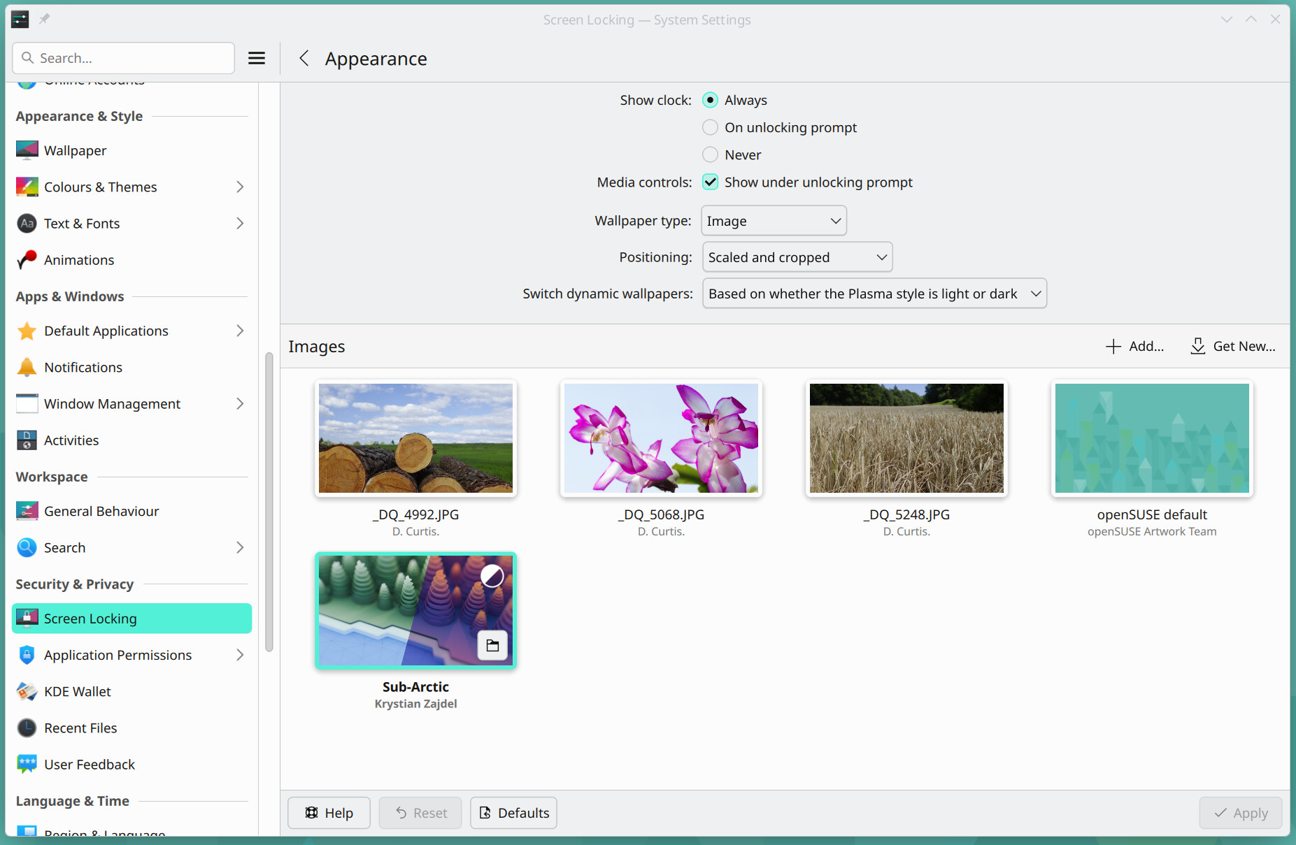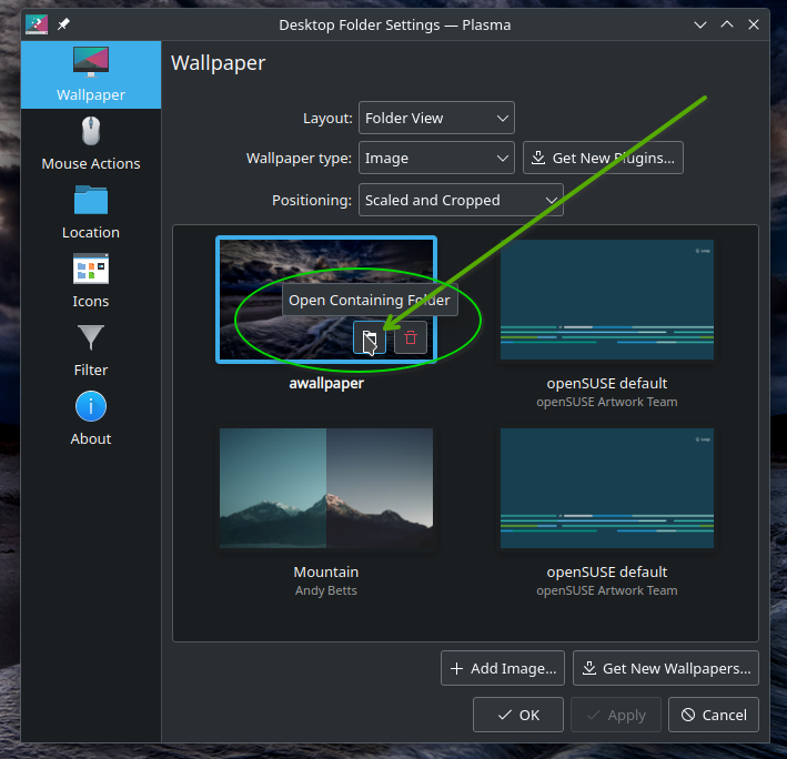 I have a total of four wallpapers - the image I’m hovering over (mine), plus 3 openSUSE defaults.