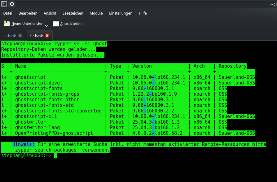 stephan@linux64:~> zypper se -si ghost