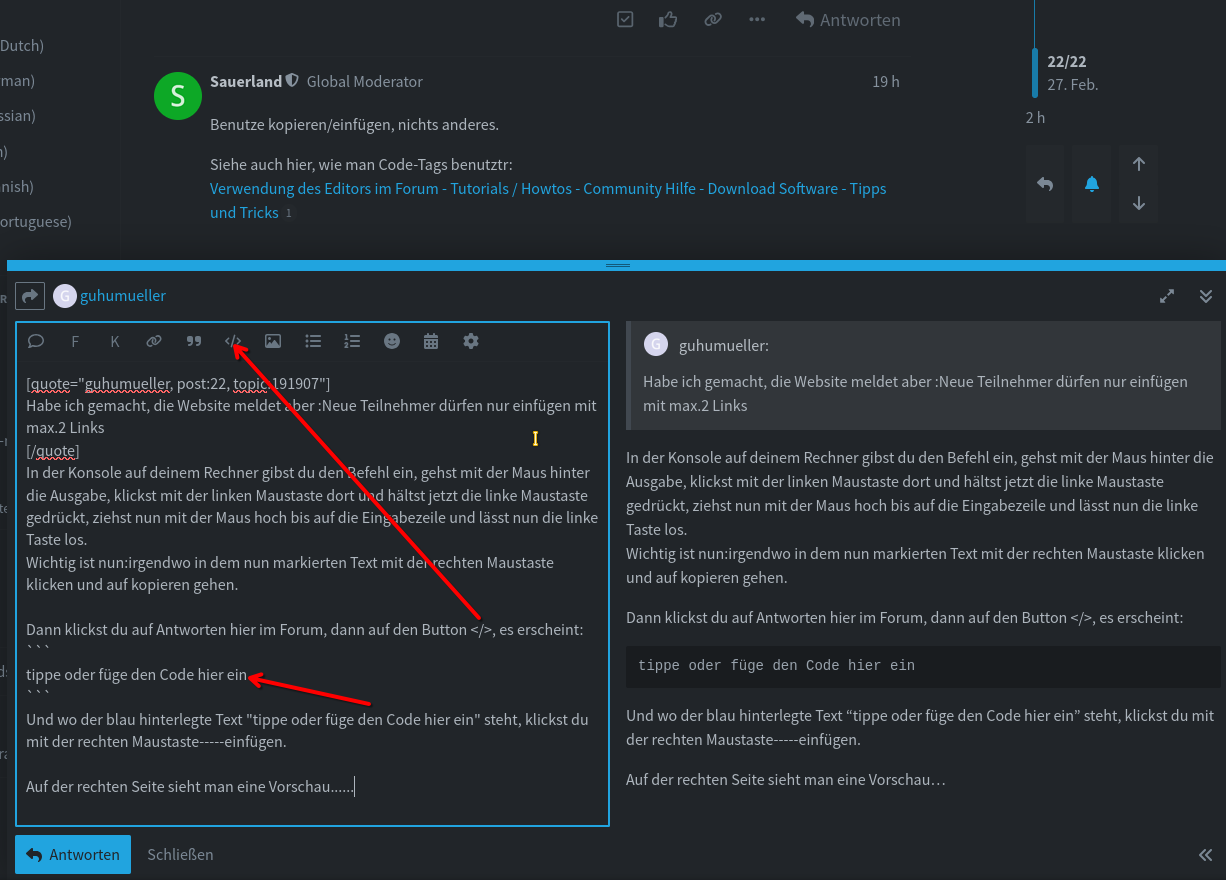 Dann klickst du auf Antworten hier im Forum, dann auf den Button </>, es erscheint: