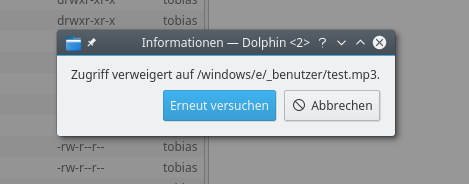 a message box pops up and states ‘access denied’ and refers to the destination where the file should be copied/moved to. When closing the message box the file is indeed copied/moved despite the message and dolphin likely crashes (not always). Independent of file size. Happens also for small files.