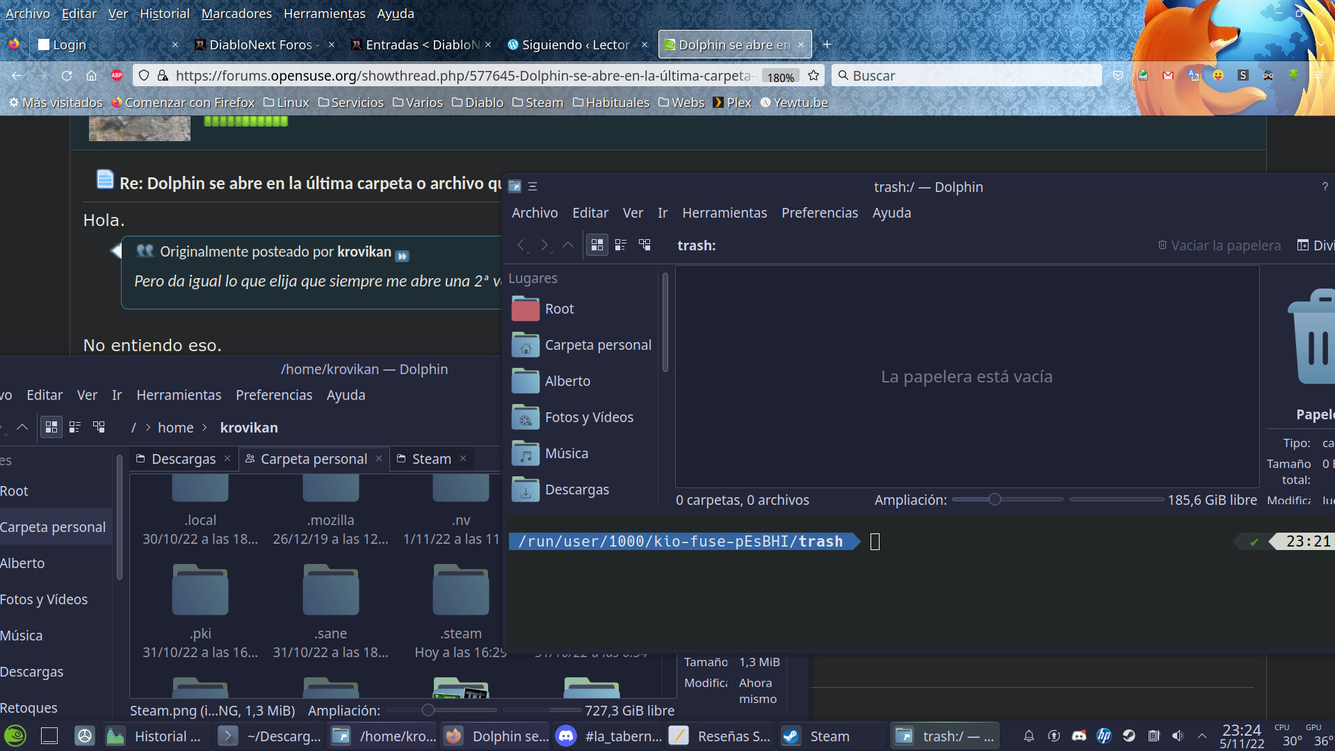 A la izquierda tengo la ventana de siempre de Dolphin abierta. Cuando le doy a la papelera (da igual lo que seleccione en Preferencias–>Configurar Dolphin–>Inicio–>Mostrar al inicio, ya sea “Estado de capetas, etc” o poner /home/krovikan) me abre una 2ª ventana de Dolphin con sólo la papelera.