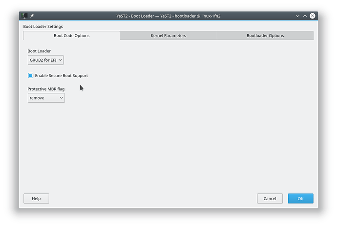 You could switch to grub2-efi in Yast bootloader, and I think you already rehearsed that. That will probably fix the booting problem, by building a “grub.cfg” that uses “linuxefi” and “initrdefi” in place of “linux” and “initrd”. But that might break your other way of booting with your other USB. So maybe I’ll let you think about this. By the way, one of the things that I like about Leap 15.2, is that it fixes this. With its newer grub-2.04, “linux” and “linuxefi” do the same thing, so you can have identical “grub.cfg” for UEFI booting and for MBR booting.