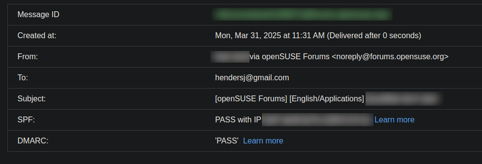 It appears that forums.opensuse.org doesn’t have an SPF record set up in its DNS. Perhaps that’s got something to do with it. As I understand it, this DNS record tells e-mail receivers which hosts are authorized to send e-mails on forums.opensuse.org’s behalf.
