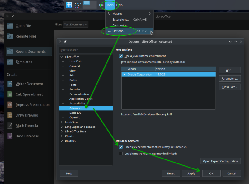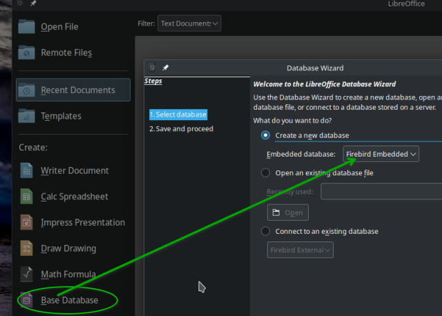 Go to your System menu, then Office, then LibreOffice (not LibreOffice Base). And now using its main menu choose: