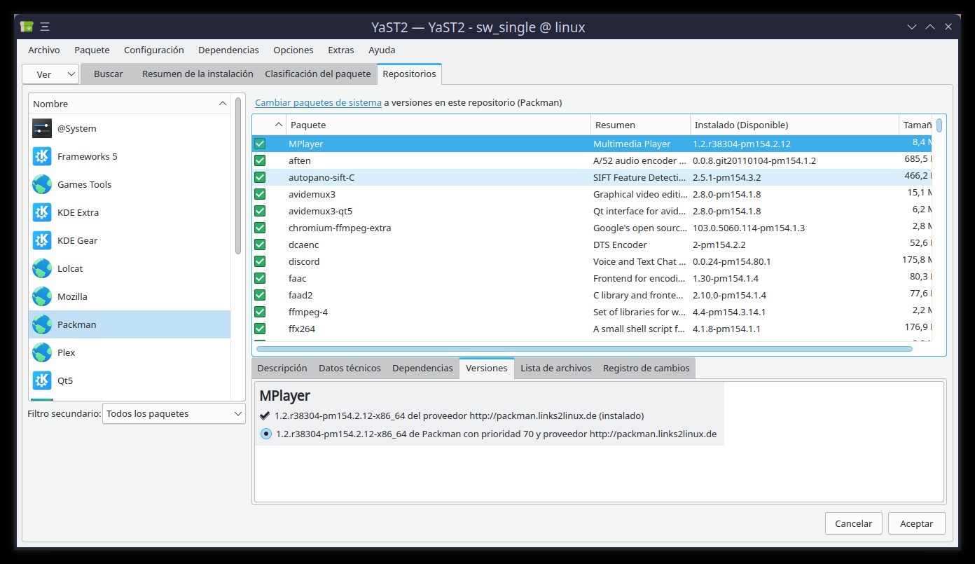 Gracias Chrysler. Por ahora he reinstalado opensuse para probar y he instalado vlc via flatpak para tener los codecs privativos de mesa y ver mp4, mkv,…pq sin el repositorio de packman no se ven.