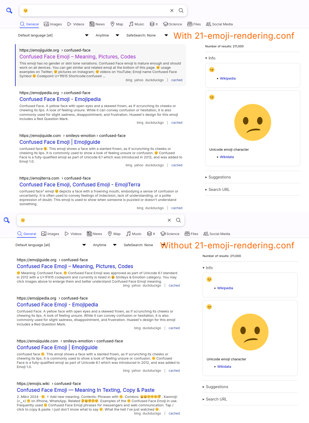 I’ve noticed that emoji look weird in (rpm) Firefox (look at those spooky triangle eyes!). After deleting /etc/fonts/conf.d/21-emoji-rendering.conf, emoji got rendered properly.
