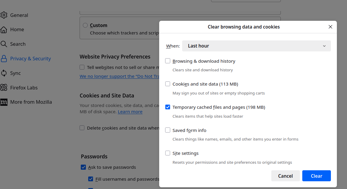 For the lazy and bone idle . . . as mentioned by another poster, you can “clear cache” from FF, they just don’t offer it openly the way they used to. >Settings >Privacy & Security >Cookies and site data >clear data opens window with options.