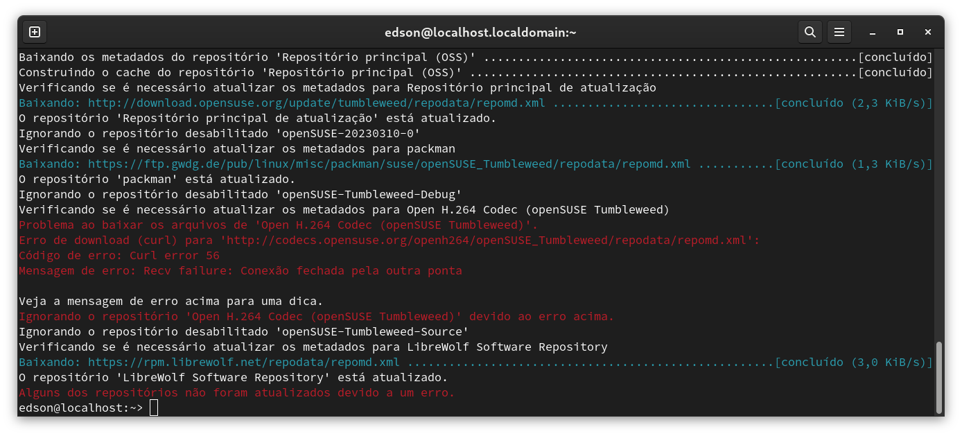 Estou tendo tendo problemas para atualizar o openSuse TW. Existe algum aviso sobre? Mais alguém está passando pela mesma situação? Isso está ocorrendo desde as 07:00h desta manha de terça-feira dia 23/05/2023. Isso está ocorrendo com IP normal ou usando vpn.