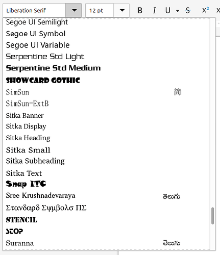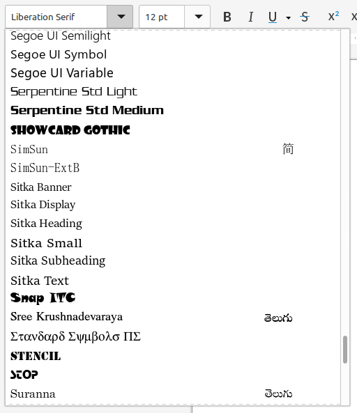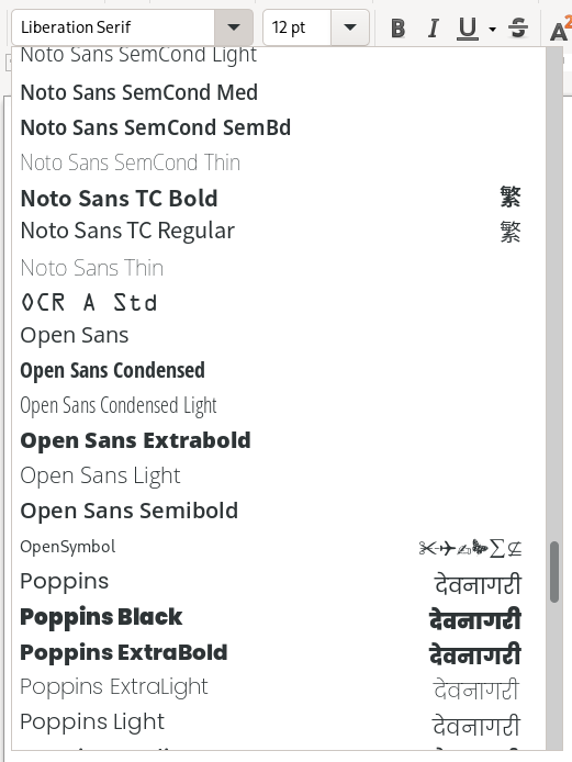 The font menu from LibreOffice Writer in openSUSE Leap 15.4/Gnome 3:
