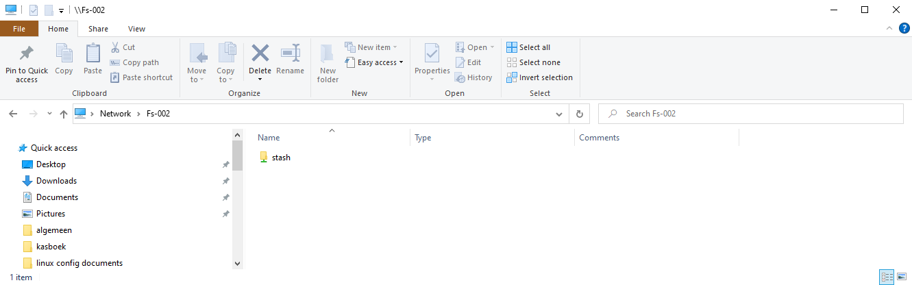 - The shares are created in the root level of the Linux System (FS-002). Of them the stash is relevant for this test and only intended for testing purposes.