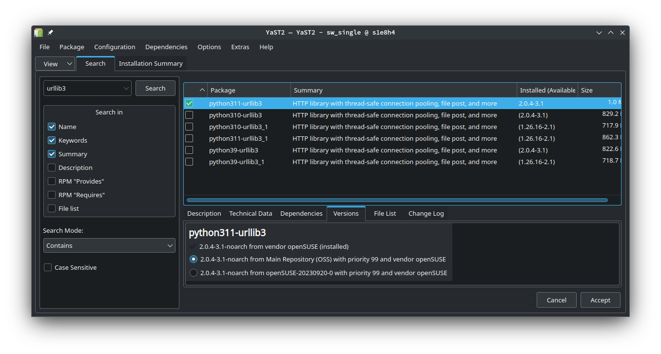 Perhaps you are looking at “python311-urllib3_1” which does show in the top section of your Yast image. You should be able to just select that. Testing here, there’s a conflict message saying that I need to remove “python311-urllib3” to do that.