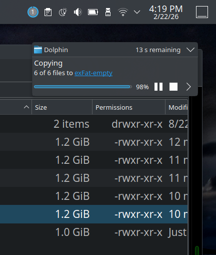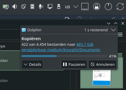 If you refer back to my screenshot - there’s the Taskbar (mine is at top of screen) and we also see the upper-right corner of Dolphin window, displaying the content of the destination USB stick, as the copy is happening.