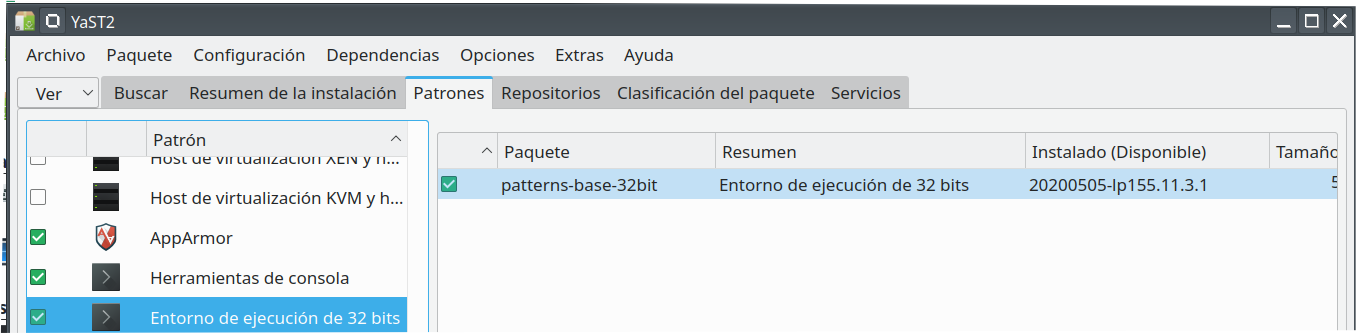 Si el entorno del driver es de 32bit, tienes que instalar el run time para 32bits ,instalador de soft de yast, ver por patrones y marcas paterns -base -32 bits , esto permite ejecutar drivers,programas, etc de 32bits en maquinas de 64 bits .