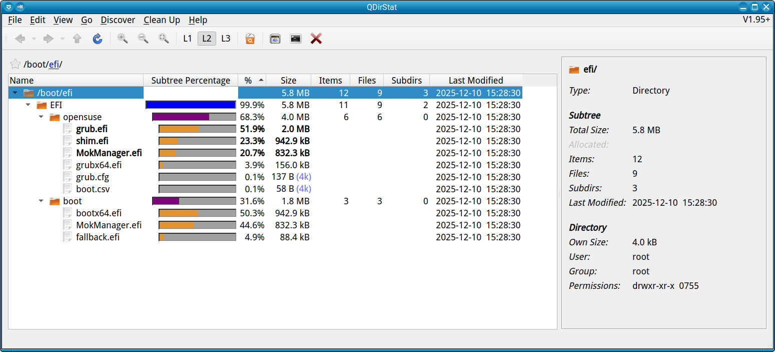 This is how little disk space you need for Tumbleweed or Slowroll in your ESP (EFI System Partition) if you use the normal “grub2-efi” bootloader: