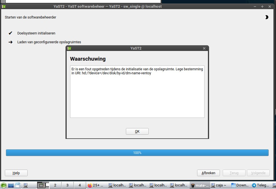 Probleem bij ophalen van bestanden van ‘openSUSE-20230108-0’. Lege bestemming in URI: hd:/?device=/dev/disk/by-id/dm-name-ventoy Zie bovenstaande foutmelding voor een hint. Waarschuwing: Slaat opslagruimte ‘openSUSE-20230108-0’ over vanwege bovengenoemde fout. Enkele opslagruimtes zijn vanwege fouten niet vernieuwd.