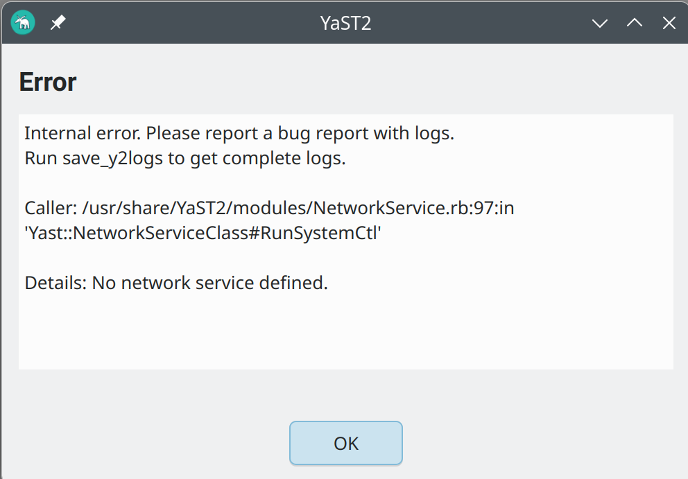 I checked network settings in Yast and it was set to static ip. I switched to DHCP and I got this error: