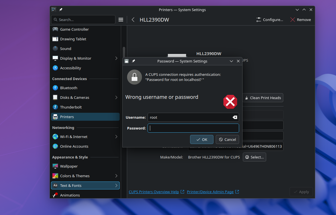 When I try to access the printer under system settings I keep getting a pop up from CUPS asking for my root password. The password never works?