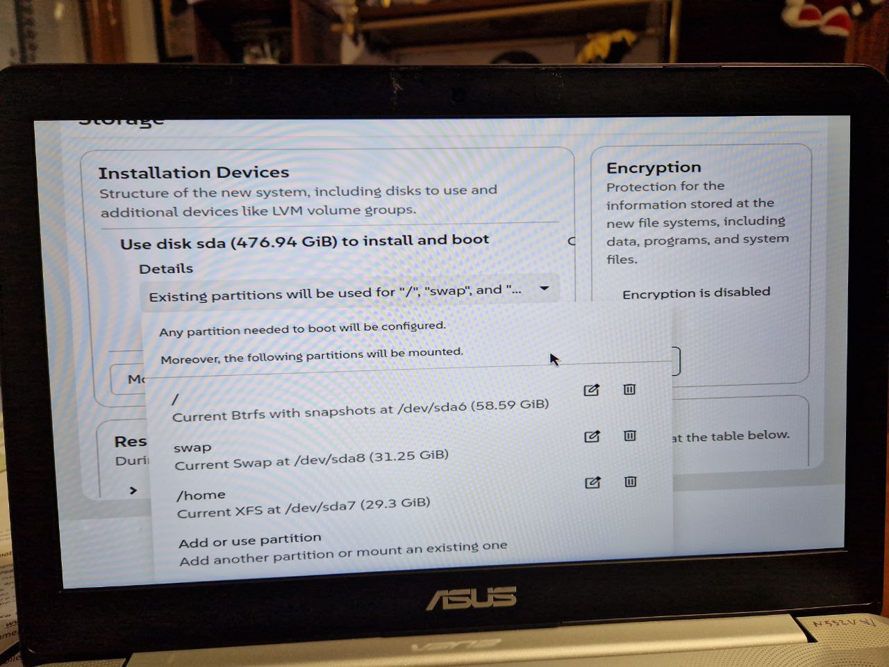 agama appears but I tried many options but cannt setup to use existing partitions, how to use the existing / (sda6) and /swap (sda8) partitions and leave unchanged /home (sda7) and windows partitions (sda3 4 5) data partition (sda9)