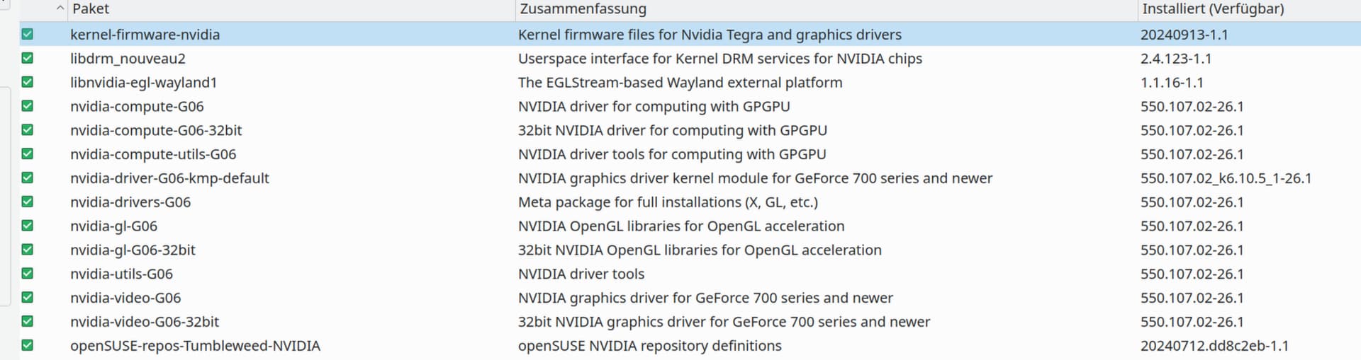 I’m running Tubleweed on my laptop which has Nvidia 1650M graphics card and just installed all available updates which also installed new kernel 6.11.0-1. I’m also running the Nvidia driver version 550.107.02-26.1.