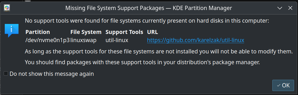 The command indicates the packages are installed. Still getting the error screen. By the way, I got a different one when I plugged in a USB drive. It said I didn’t have dosfstools. So I did that same command and got them. Now I don’t get that particular error. Just the original one about swap support.