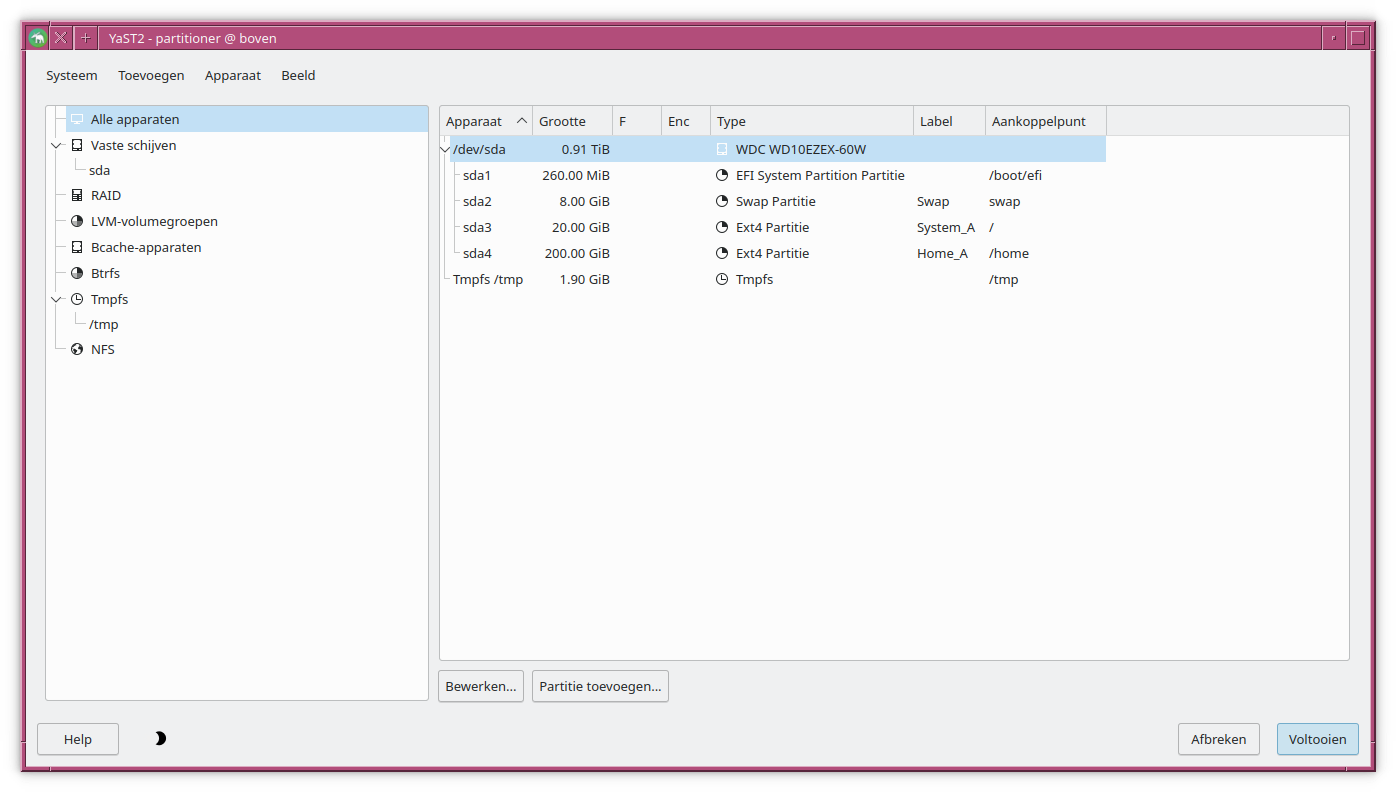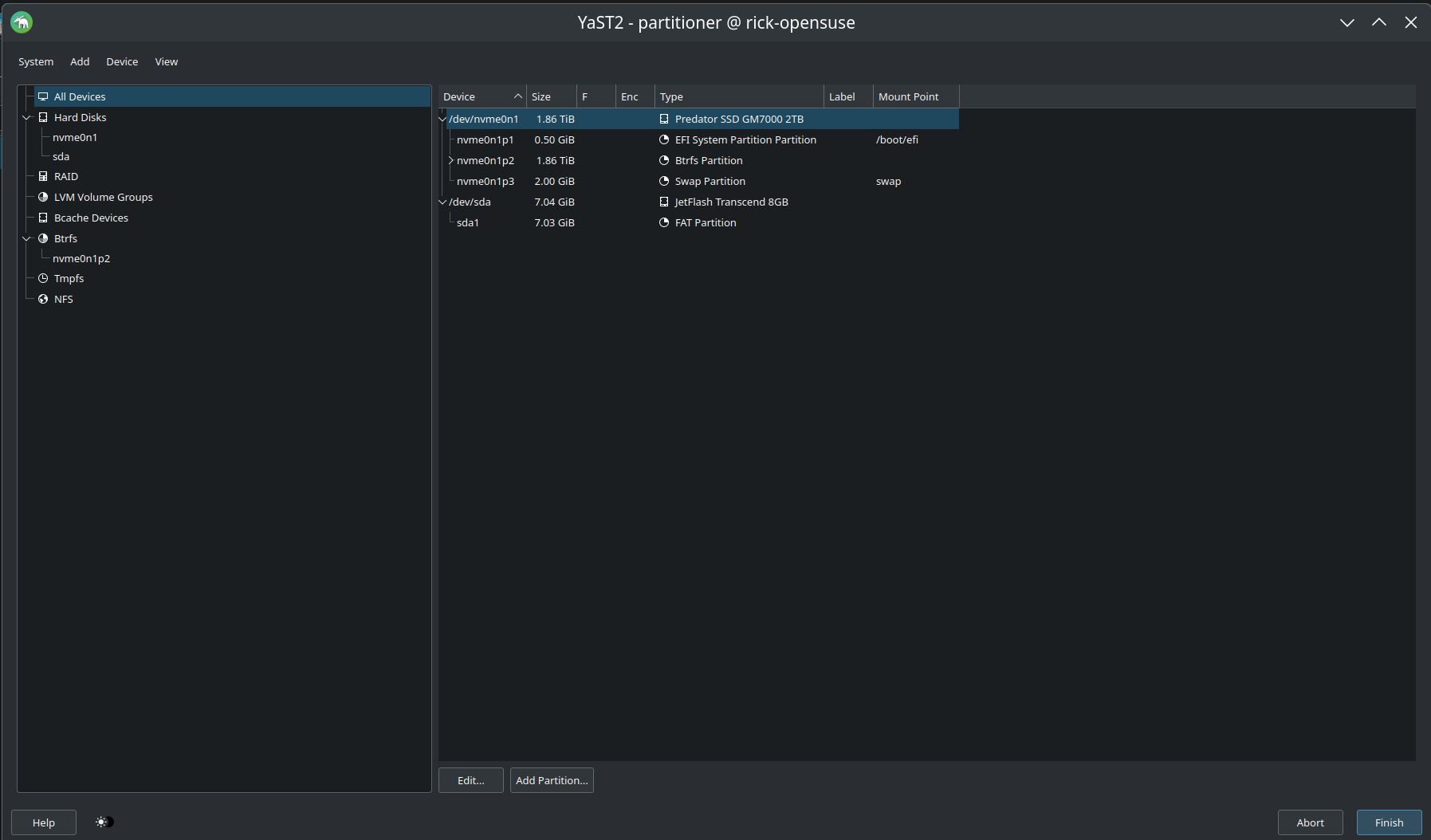Hello hcvv, I have tried to use yast partitioner but it always fails with error about system not mounted at / when I try to apply changes. Besides, KDE partitioner you just right click the partition and choose what you want to do. In Yast you have to keep clicking page after page to do the same things.