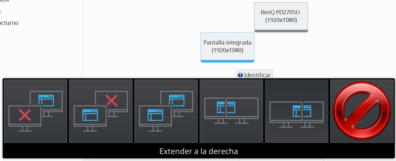 Le doy Click o Enter en extender a la derecha y no extiende, sigue estando la misma imagen que se ve en mi laptop. O si en configuración de pantalla elijo que se extienda (y lo hace), luego con F3 le digo que ya no extienda y sigue extendida, no hace nada.