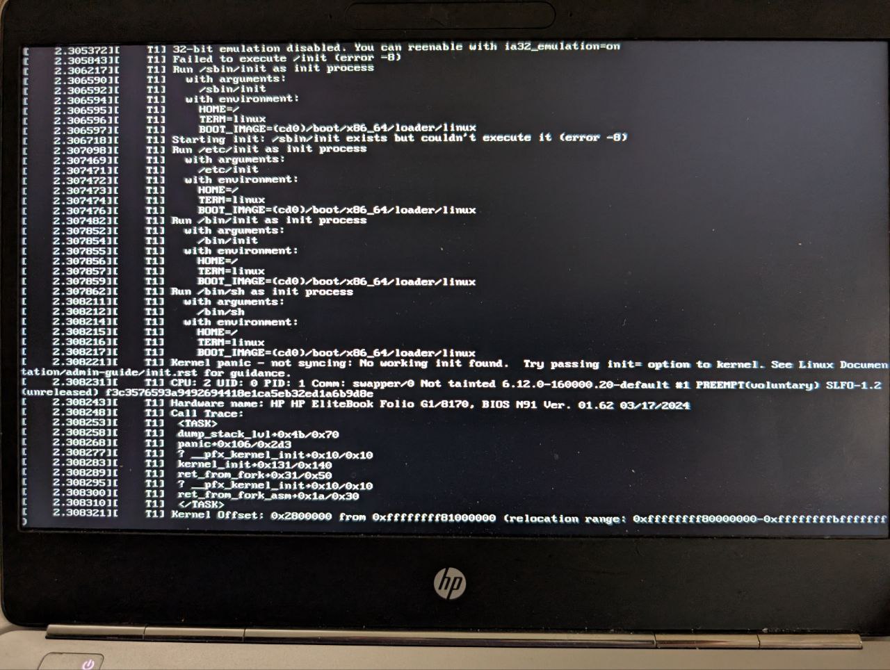 I booted with Leap-16.0-online-installer-x86_64.install.iso on my HP laptop, but I got the kernel panic as I attached its screenshot
