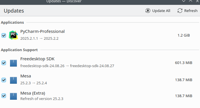 Discover shows updates available. But zypper update shows none. pycharm is installed from flathub, so may fall under discover, but mesa and mesa extra should be available from CLI. Will those updates appear later in CLI?