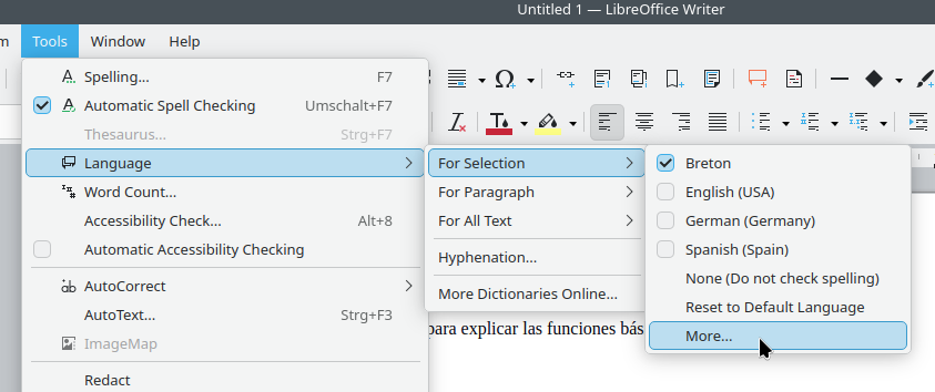Adding an additional language to the Tools->Language menu is quite easy. Simply click on “More” and select the wanted language: