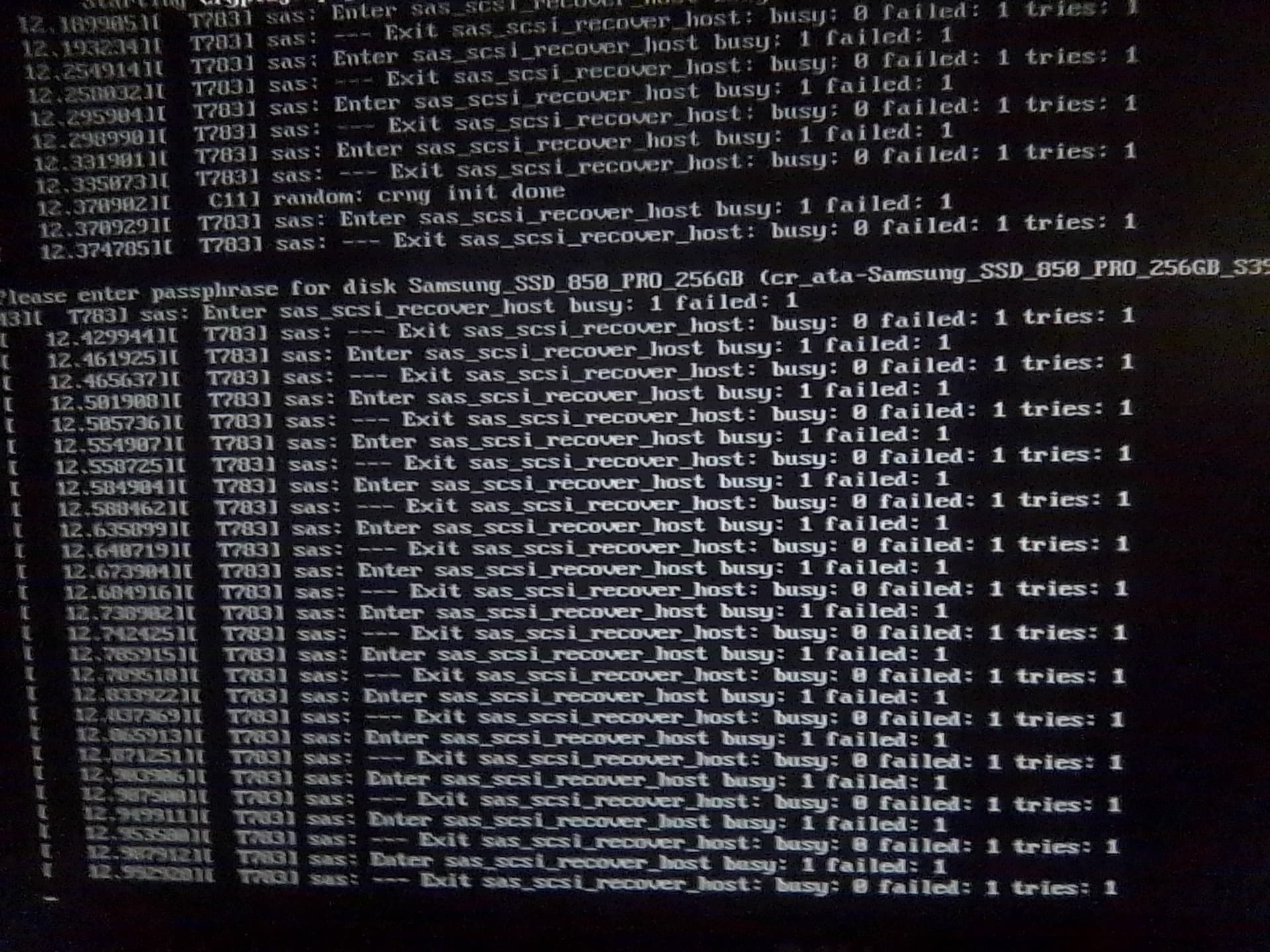 Hi, I am using the grub2-bls bootloader with Tumbleweed and wondering about the all of the sas related messages displayed during boot. Booting halts and I have found that I can then press the esc key which in return displays the LUKS passphrase entry prompt.
