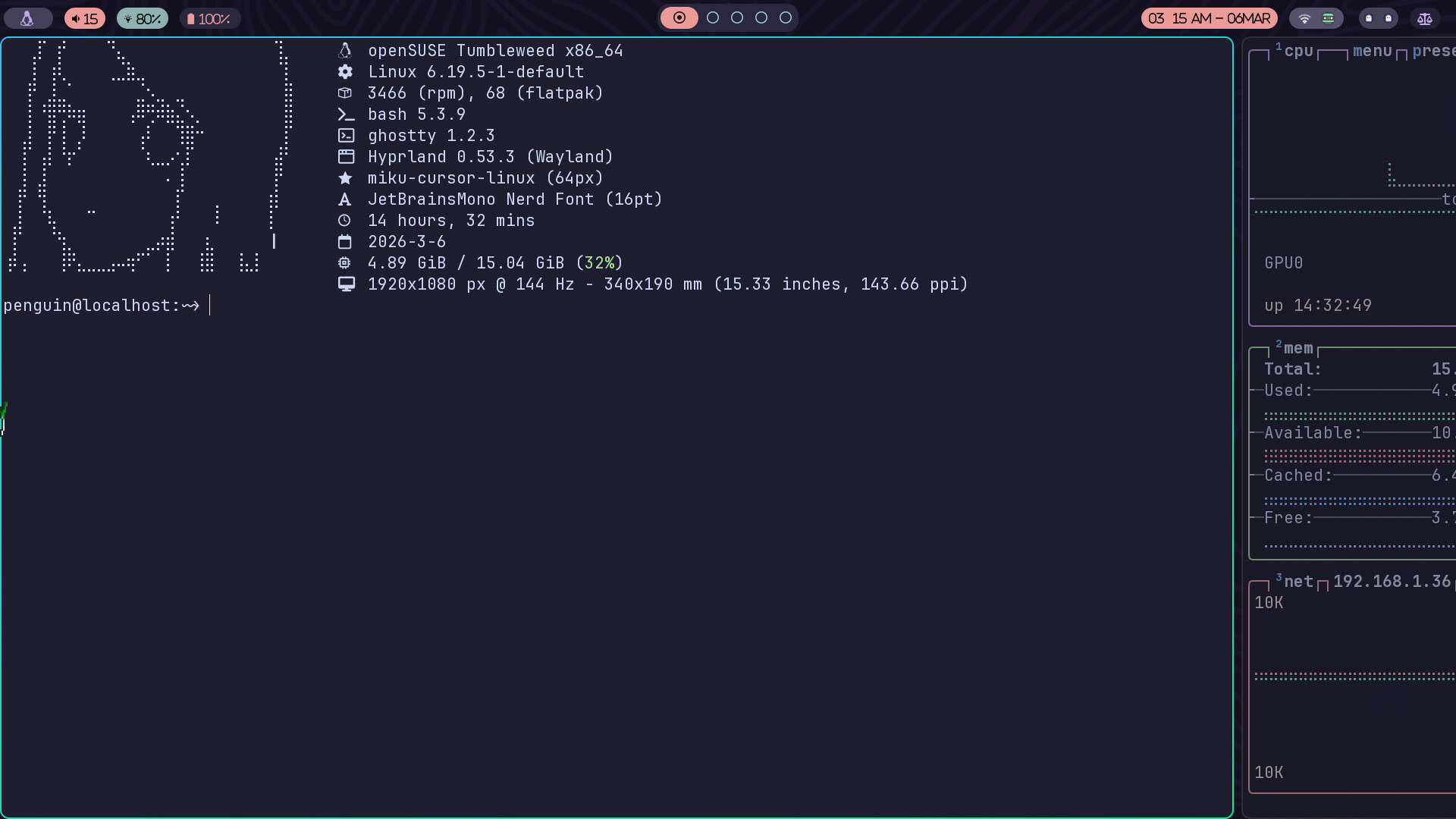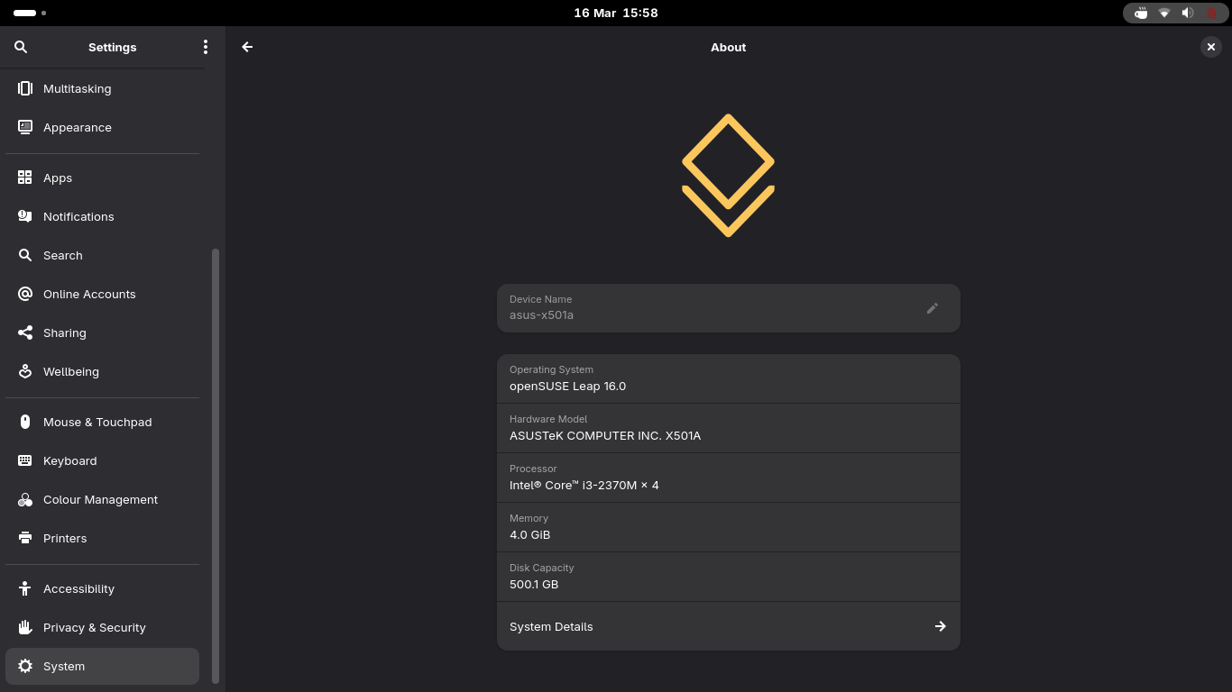 I recently resurrected a secondary laptop, an ancient ASUS-X501A, with openSUSE Leap 16, and I’m honestly amazed by how fluid it feels. Even with just 4GB of RAM, Gnome 48 is surprisingly fast, handling my simple daily tasks (web browsing, email, etc.) without any problem. I tried to keep Gnome as much vanilla as I could, despite I ended installing a few extensions though… A massive thank you to the devs and maintainers for your incredible work!