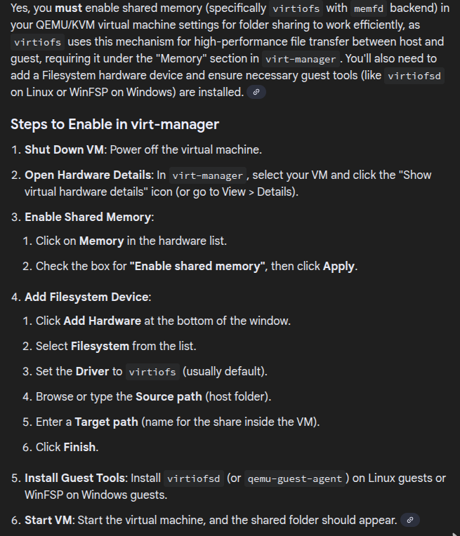 If we want to use a shared folder between the guest and the host system on kvm/qemu, we need to enable shared memory in the vm settings.