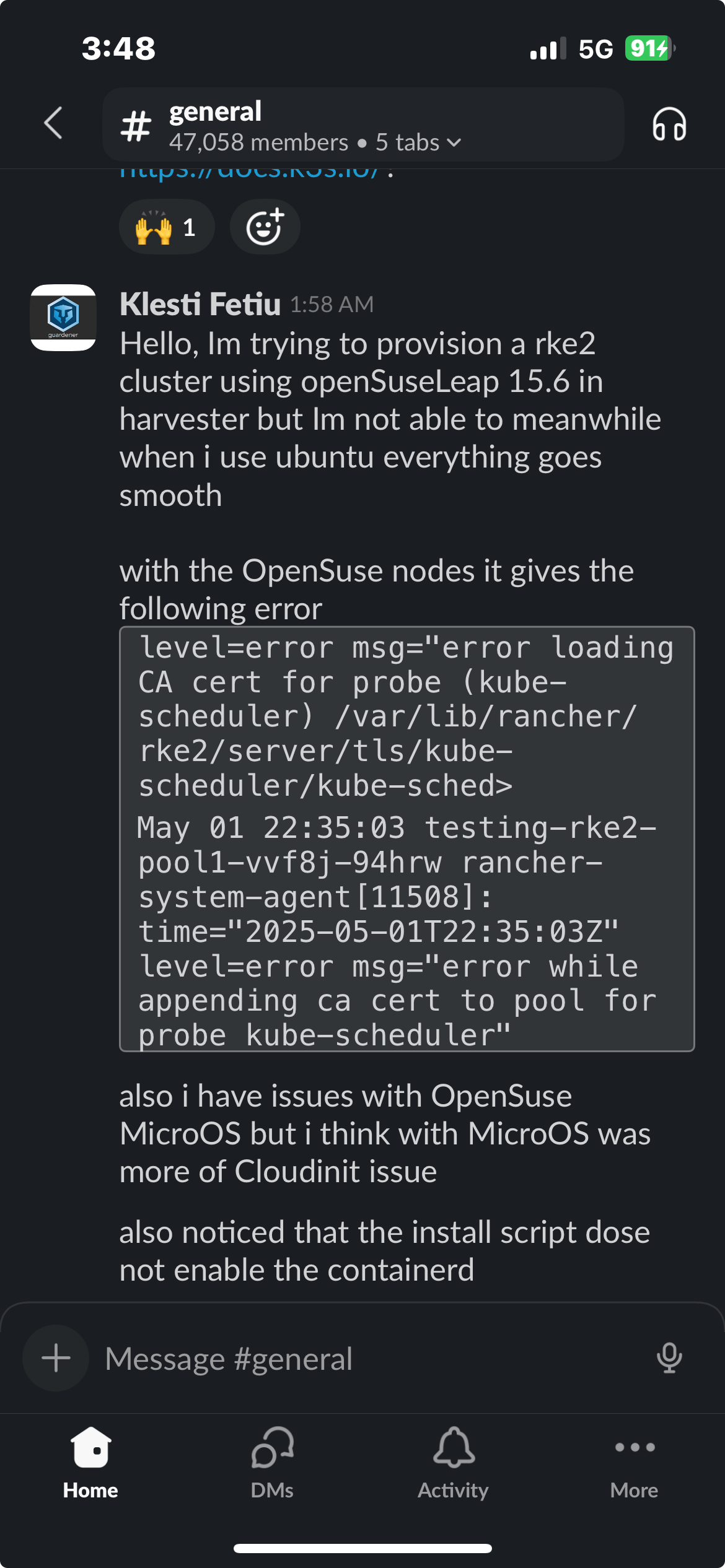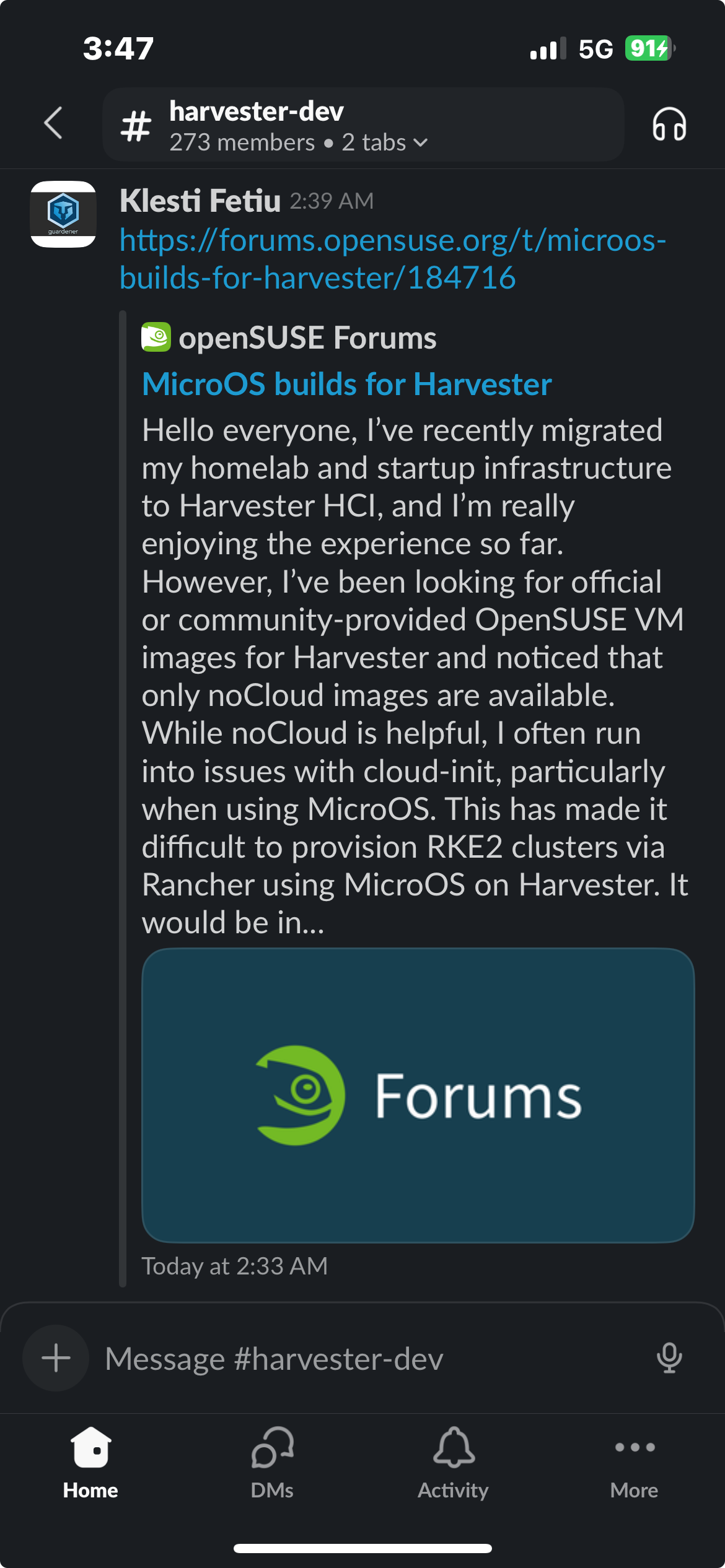 I’ve recently migrated my homelab and startup infrastructure to Harvester HCI, and I’m really enjoying the experience so far. However, I’ve been looking for official or community-provided OpenSUSE VM images for Harvester and noticed that only noCloud images are available.