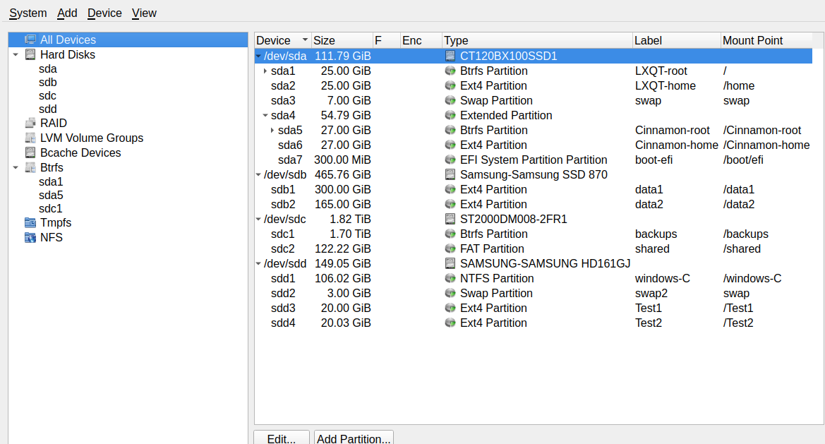 Before the update to 15.5, when I was trying to “fix” things with Gparted, it showed all 4 drives with all partitions visible. I have not rebooted to Gparted-live yet to see what it shows currently.