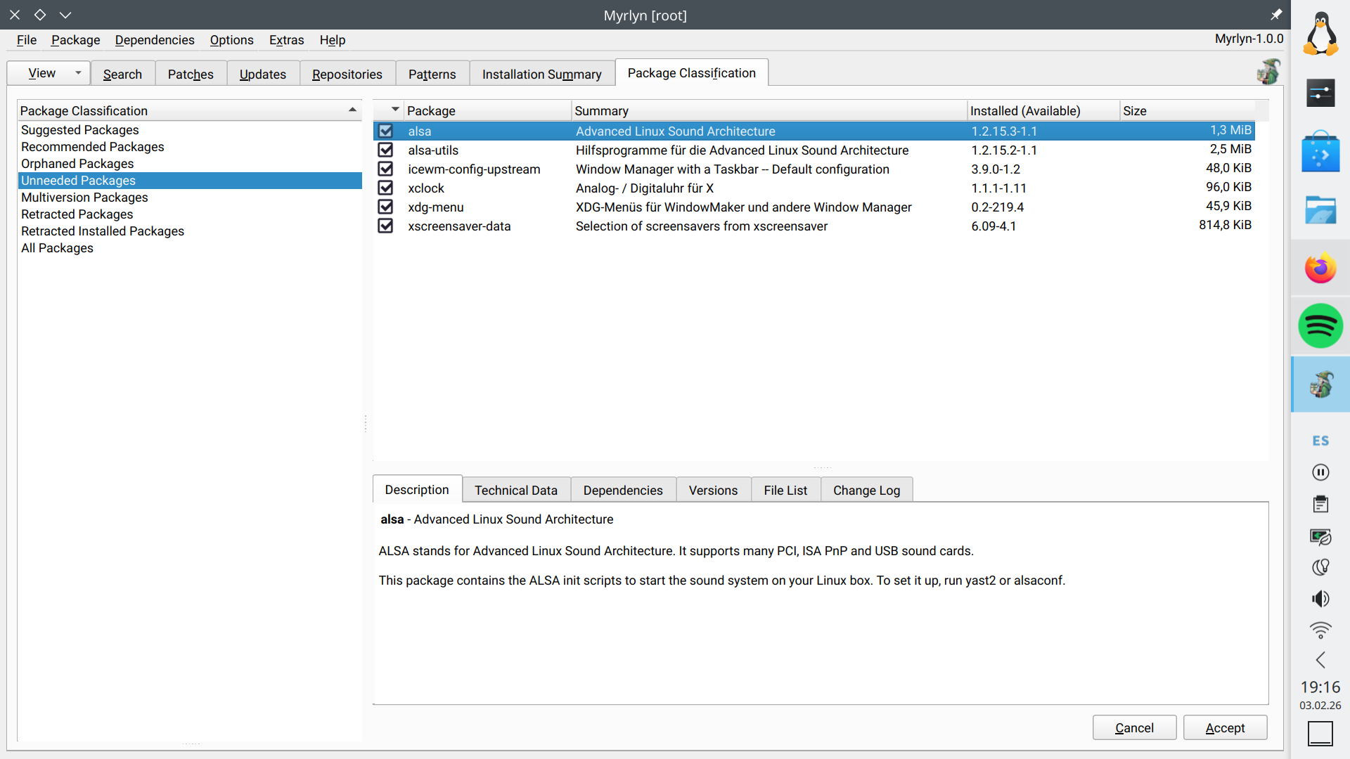 I installed openSUSE Tumbleweed on my laptop and while managing some packages through Myrlyn, I noticed that it marks “alsa” as uneeded package. Is this ok? I was about to uninstall the unneeded packages.
