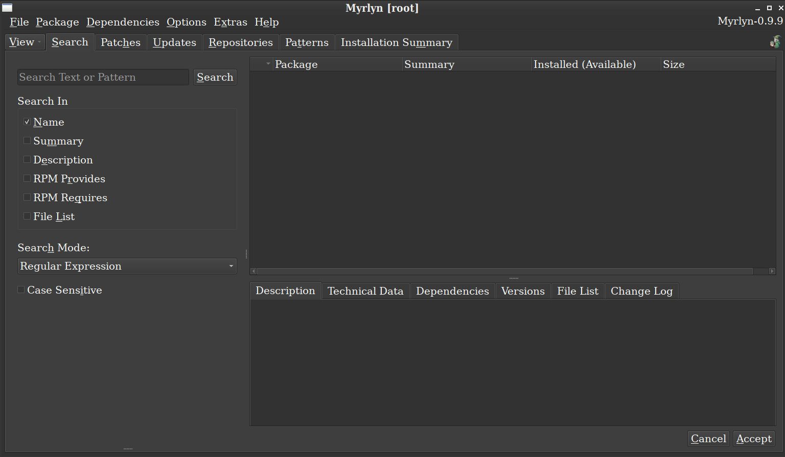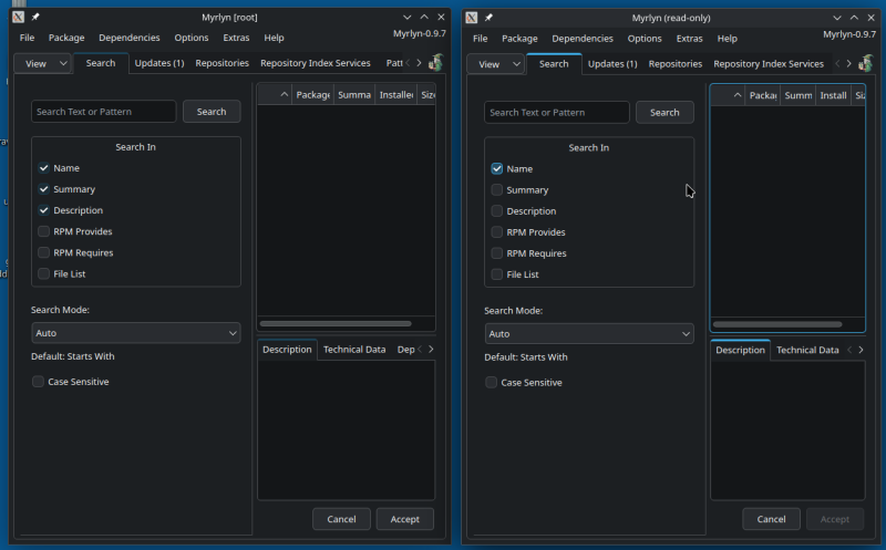 Executing as such shows Myrlyn with my user’s GUI configuration (Breeze Dark) and with root privileges (of course). It is rendered exactly like the Myrlyn (my user-account, read-only) version. See screenshot.