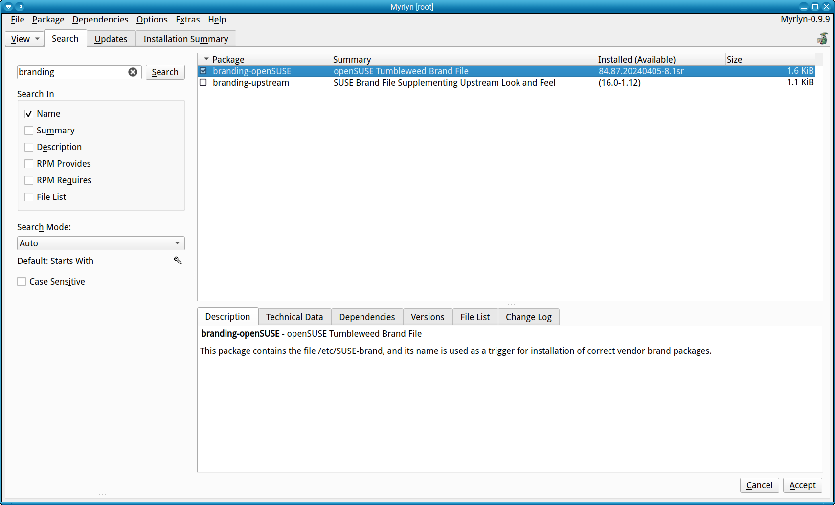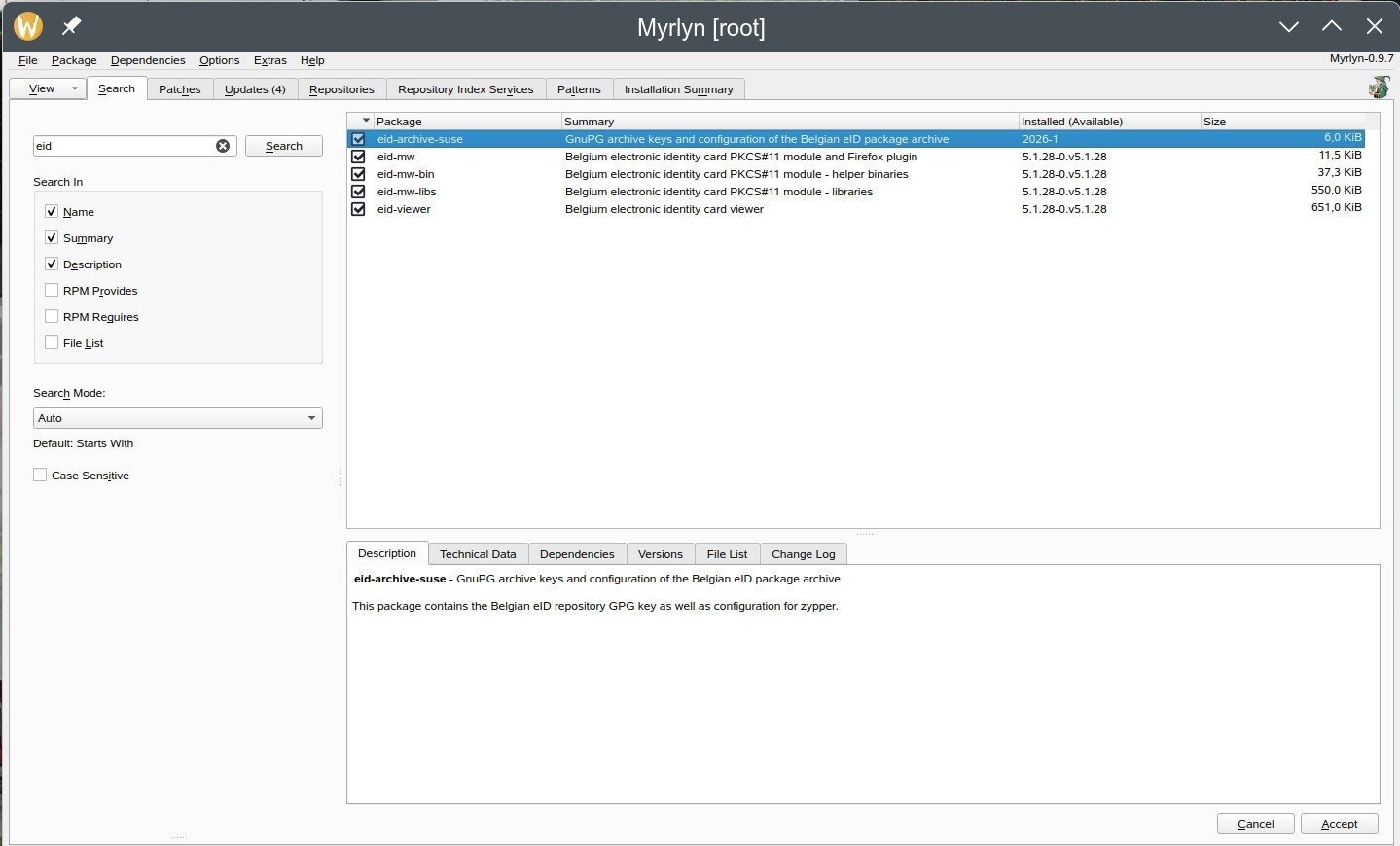 The four screenshots I join here tell the story? They’re all taken on the SAME Leap 16.0 system, on the SAME moment, two with Myrlyn and two with Yast-Software which luckily has been preserved on my system since I installed Leap 16.0 with the excellent opensuse-migration-tool. One set is a sum of the programs from the Belgian eid repo: Myrlyn shows five (5), Yast-Software shows ten (10). The second set is the search result for “eid”: Myrlyn shows five (5), Yast-Software shows thirteen (13) installed and nine (9) not installed but containing the syllable “eid”. I had already seen that Myrlyn searches only the exact name, while Yast-Software searches for any program name containing that syllable. With only Myrlyn, I would not have been able to solve the problem that arose with the “normal” eid files from the Belgian eid repository, conflicting with “ct” or something like that; I had to install the PKCS=11 modules instead, which I could only find with Yast-Software and not with Myrlyn. I suppose it would be better if Myrlyn’s search function could match that from the late Yast-Software.