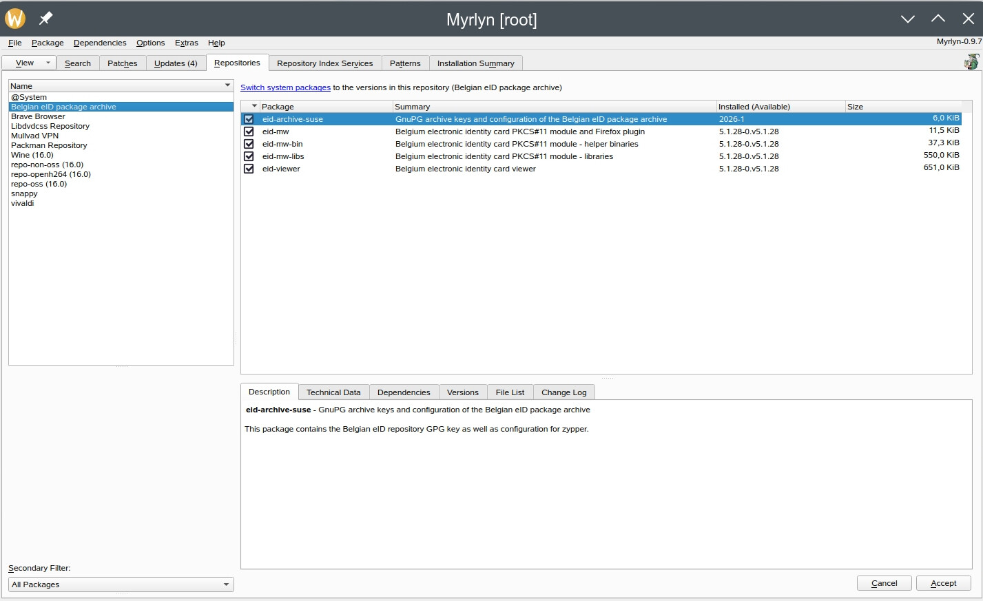 Which repos? You can see that in the left column of the two screenshots with the “Belgian eid repository”. All the enabled repos are there. On the right side, you have what Myrlyn and what Yast found in the Belgian eid repo.