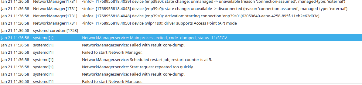 Jan 21 11:48:00 production systemd[1]: NetworkManager.service: Main process exited, code=dumped, status=11/SEG