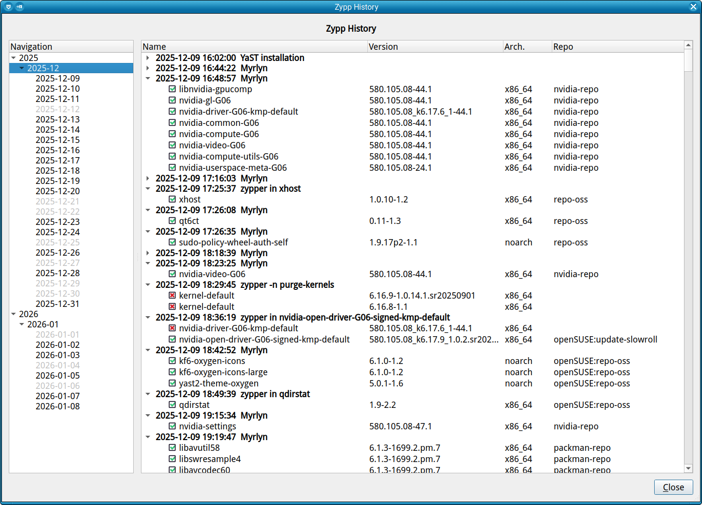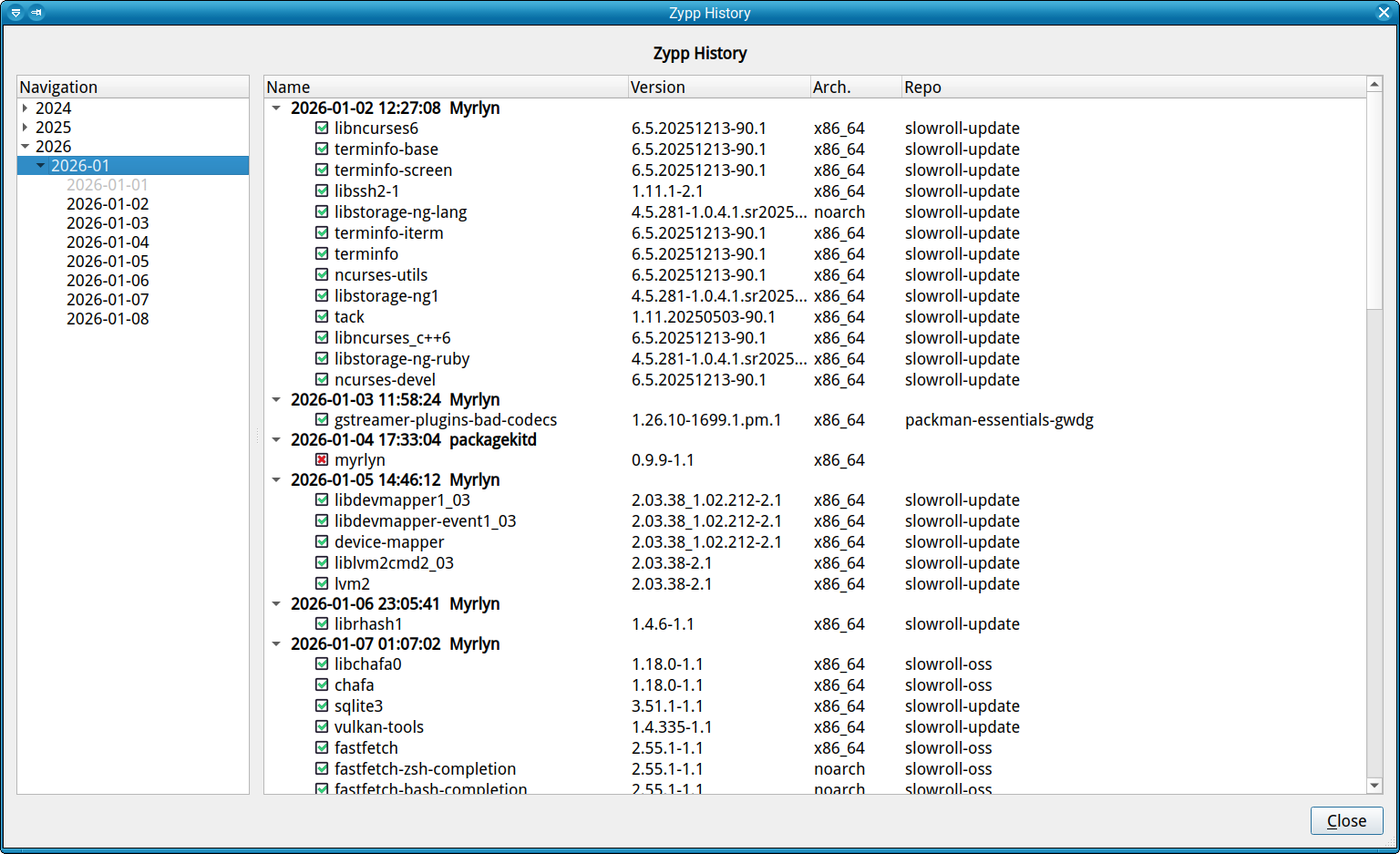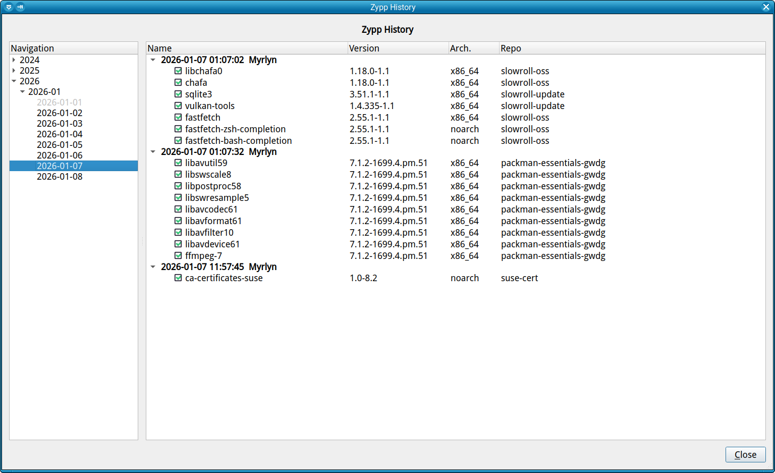 This is nothing more than a nicely formatted /var/log/zypp/history, but it’s human readable, and it’s much easier to browse in that thing.